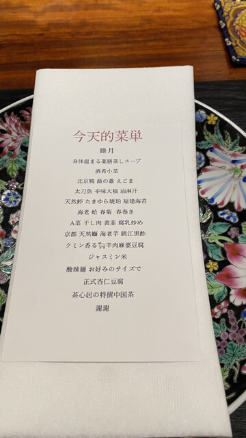 料理はコースで、伝統的中華料理というよりも、中華テイストに、いろいろな素材が使われていて、実に多彩な料理で、新しい味の発見、素材の組み合わせの妙味も味わえて、大変おいしく、また楽しいです。