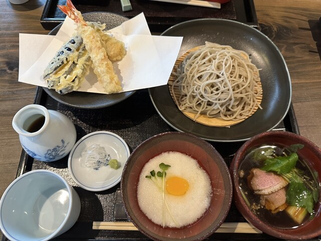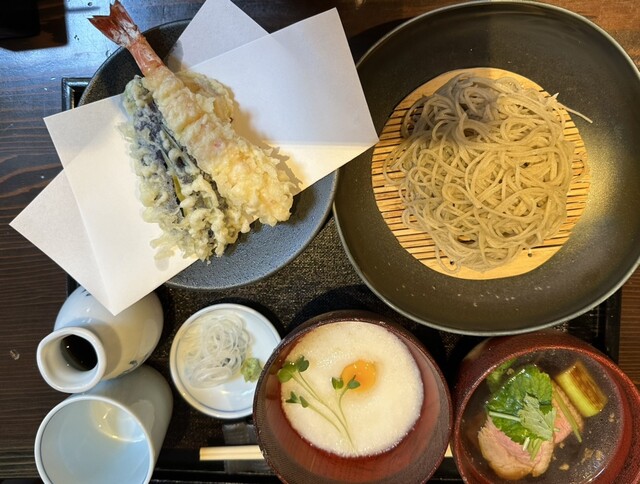 会津山都の十割そば、こだわりの塩、自慢のつゆ、とろろ、鴨汁と楽しめる上さらに天ぷらが付く贅沢なセット。