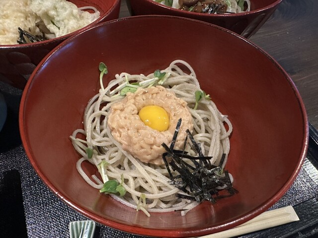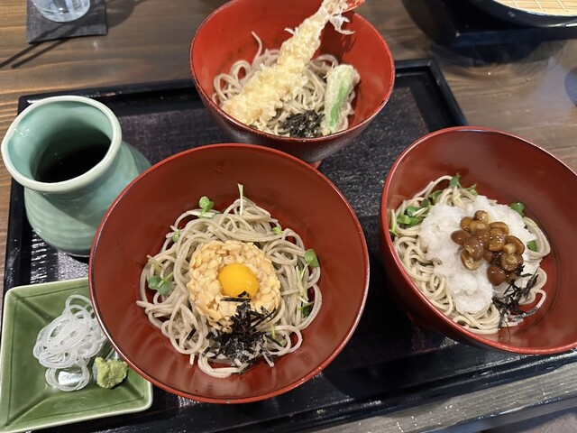 塗りのお椀に丁寧に盛り付けられた天ぷら、なめこおろし、納豆の3種が載った冷たい三味そば、とても美味しいです!