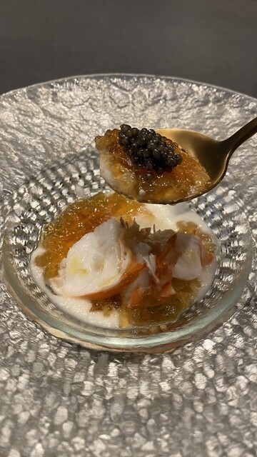 *伊勢海老×新玉ねぎ 黒潮町のぷりぷり伊勢海老と、桐島畑で育てられた有機野菜の瑞々しい新玉葱をピューレ状にし、オーマル海老や甲殻類で作ったコンソメのジュレにキャビアものった贅沢な一皿✨