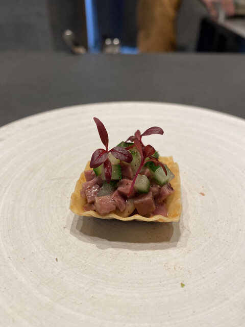 *アミューズ ・サクサクのサブレ生地に、鯛を昆布で1週間締めて熟成させタルタル状にしたものに、脂ののったサクッとした食感が特徴のトンゴロイワシの香ばしいハーモニー˖