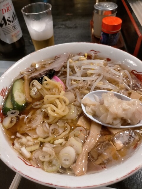 あっさり系スープにちじれ麺、大量のゆでもやしにシナチク、きゅうりが入っているのがまた清涼感がまします