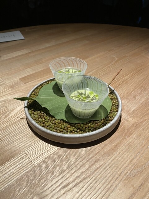 ズッキーニのフランに、ワカメ出汁と潤菜。続いた2皿の濃いインパクトから一転、清涼感でリフレッシュ。こんがり焼かねば青さが残るという先入観を覆す処理が見事。
