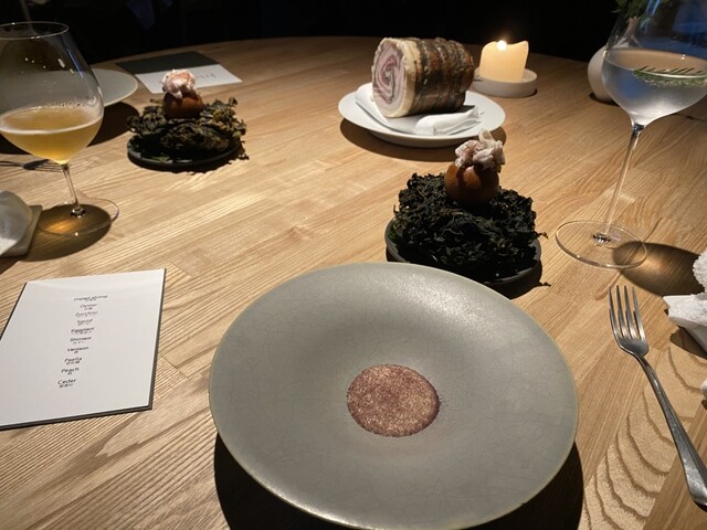 能登杉オイル、昆布茶、サワークリーム、抹茶を合わせたブランマンジェ。美味杉でした。極薄のチュイルが音もなく消え、食感だけを置いていく設計が巧緻。写真は撮り逃しました。