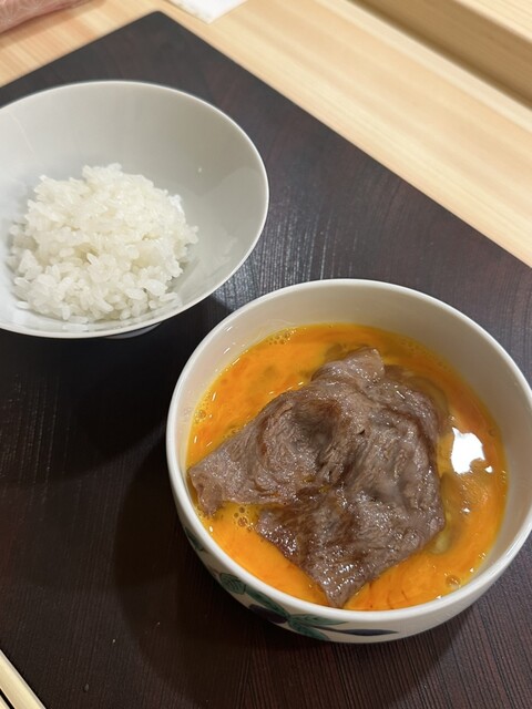 メイン料理はすき焼きです。やっぱり吉澤といえばすき焼きですよね!この日は近江牛岡崎牧場44ヶ月の和牛サーロインを使ったすき焼きでした。一枚一枚丁寧に焼いていただきます、たっぷり卵黄にくぐらせてご飯と一緒にいただきます。口の中でお肉がとろけます...本当に美味しかったです!お肉の脂で炒める白滝も絶品でした!