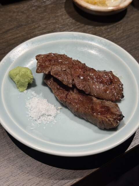 表面は香ばしく焼き上げられ、中はふんわりジューシー。ハラミの濃厚な旨味と脂の甘さが絶妙にバランスで、塩わさびでいただきました。