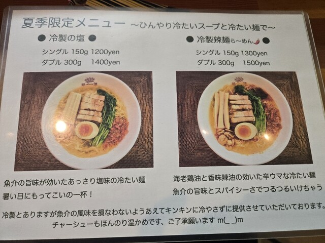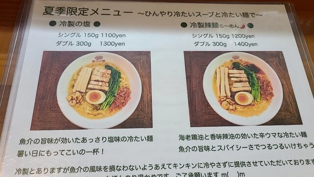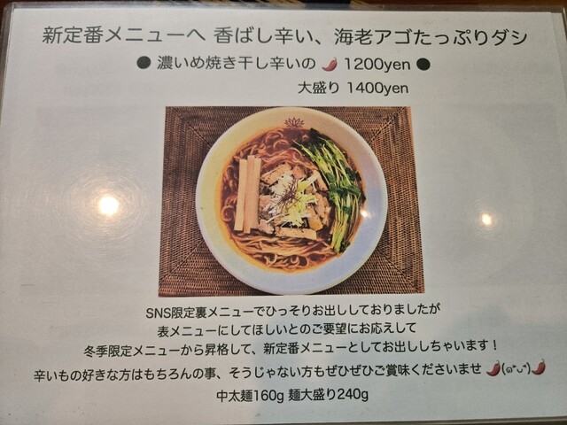 海老とアゴの濃厚魚介とピリ辛なラー油?がメニューに書かれているように香ばし辛く、濃いめ焼き干しならではの中太麺とよく絡みうまい。