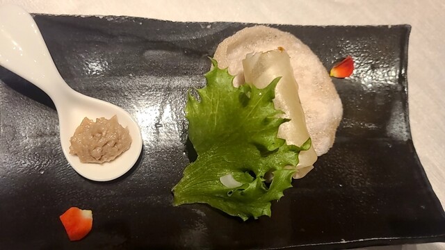 フカヒレの姿煮込みは、地元食材のアオサを使ったピューレソースで、今までにない新しいスタイルで感動。