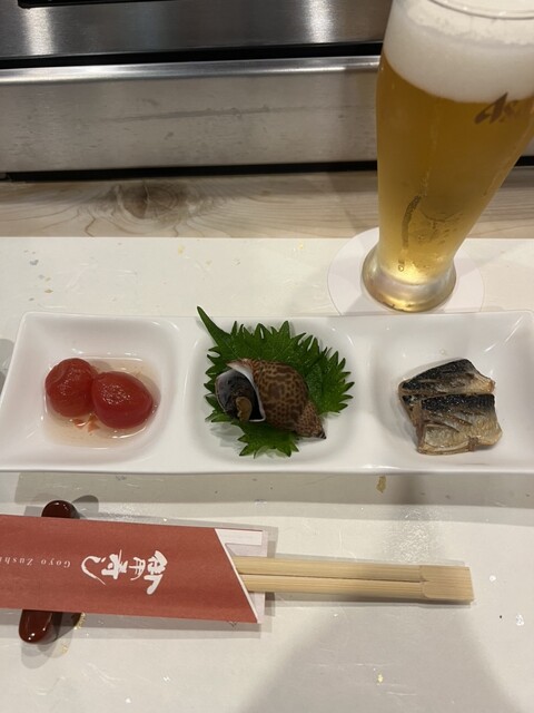 ⭐︎生ビール&お通し:ミニトマトの冷製含め煮・黒バイ貝・鰯の梅煮