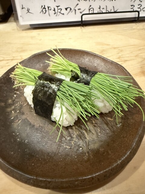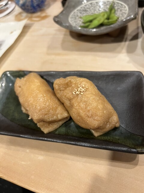 たまたまカウンターのお隣に座った、とても粋なお兄様が実は御用寿しさんに枝豆とかお野菜を供給していた達人の生産農家さんで、色んなお話を伺って盛り上がった最後に召し上がってたのがいなり寿司。