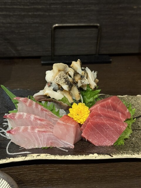 ⭐︎刺身3点盛り(本鮪、ツブ貝、金目鯛、あとなんだっけ)