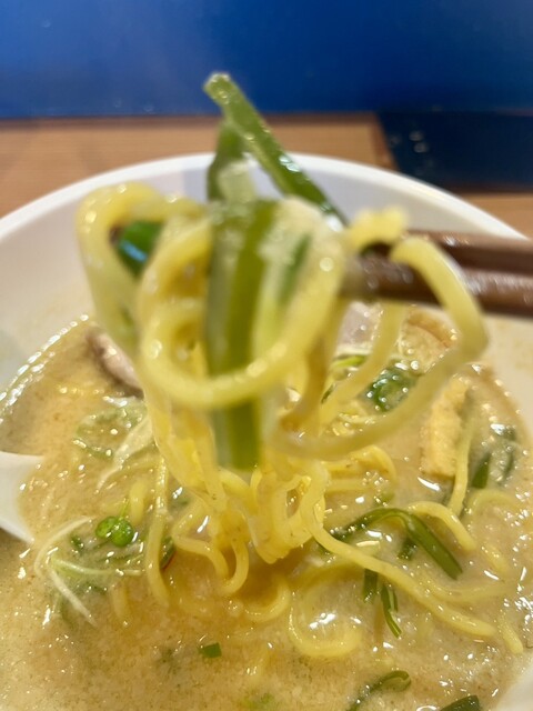 麺はたまご麺のようなちぢれ麺で、歯応えがあってスープとの相性は最高でした。