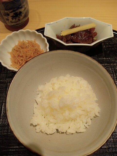 ご飯&ちりめんじゃこ、松阪牛しぐれ煮、浅漬け、鰹節、卵、おこげ&赤出汁味噌汁