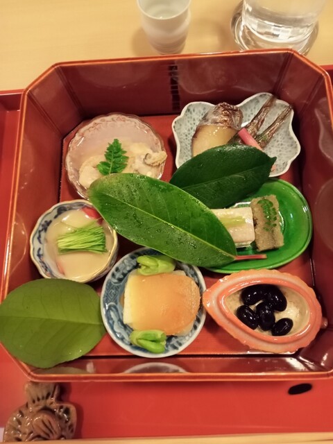 カラスミ餅、そら豆、黒豆、鰆西京焼き、モロコ、ハマグリ酒蒸し、マグロ酢味噌和え