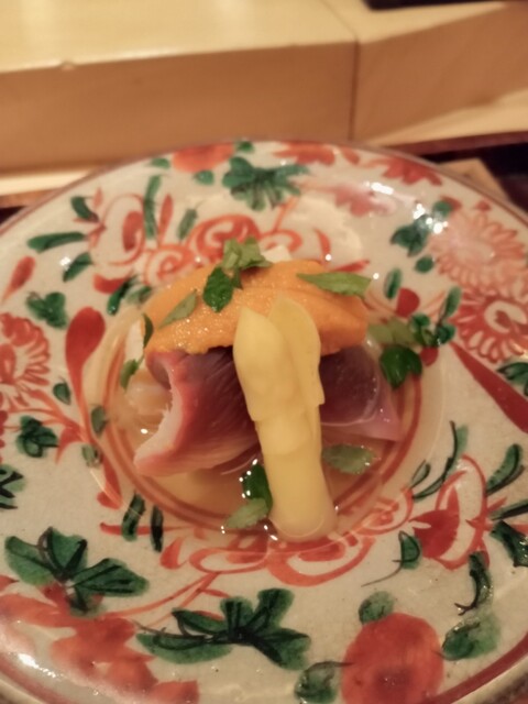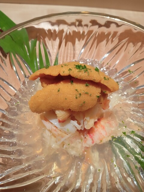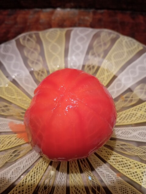 熊本産赤茄子、北海道産雲丹、ハマグリの出汁