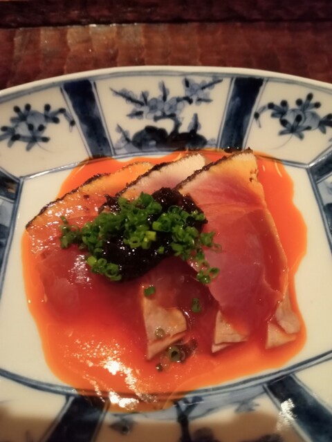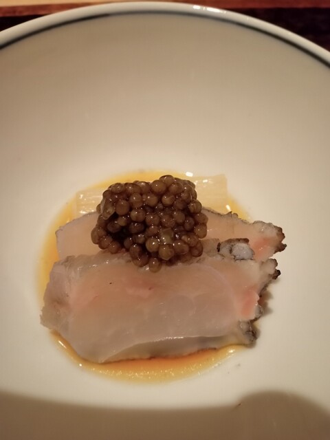 お造り:5日間熟成したクエの炙り、燻製キャビア
