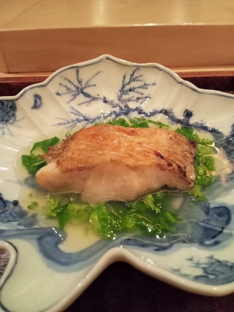 長崎産クエ、キクラゲ、芹の薪焼き餡掛け