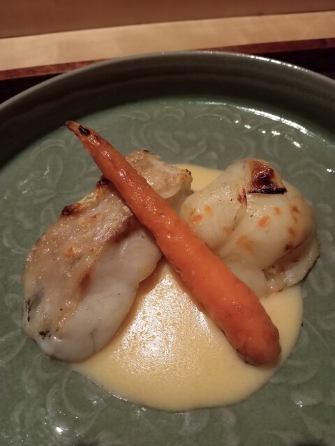 薪焼き伊勢海老、月光百合根、シジミ出汁ソース