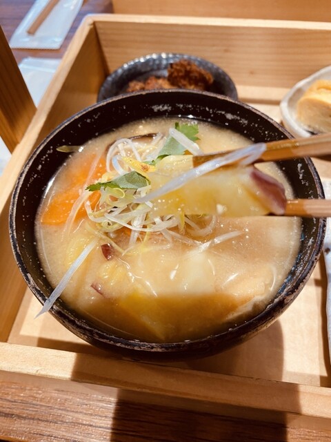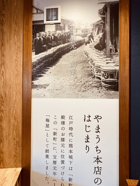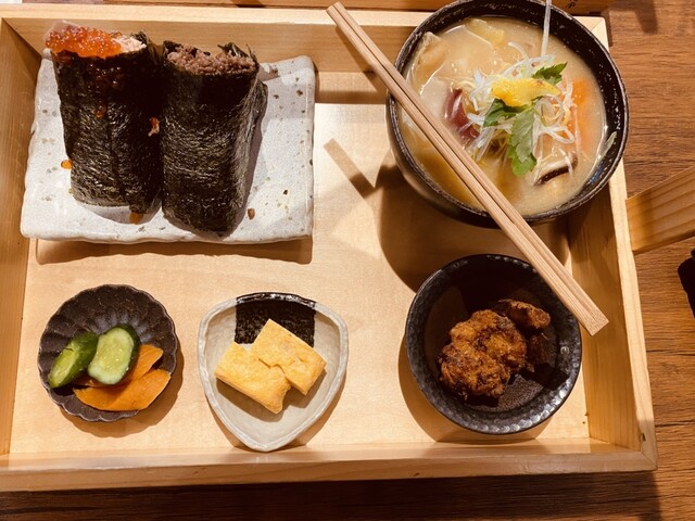 菊陽町に在る「ヤマウチ醤油本社」の敷地内に在る「日々麹舎 うまかもん食堂」に来てみた! 店舗前の駐車場は身障者用駐車スペースとなっており敷地内入って直ぐ右折し第二駐車場へと移動する!意外に分かり易くて助かる。 入り口を入り店舗奥にある引き違い扉を開け食堂へと移動!右手にあるタッチパネル式の券売機でこの日の好みの定食類をチョイスし、前精算し発券するスタイル! 自分好みのテーブル席へと移動し しばし待つ。 「 ごちそう定食(おにぎり2個)×2」 を選び 「あか牛肉そぼろ 」と 「鮭いくら 」 と「 肉みそチーズ 」 と「 ごま高菜 」を選択しての注文となった! 待つコト約7分、食堂前の電光掲示板に発券番号が表示され そしてスタッフさんからも番号で呼び出してくれた! おかもち に乗せられた料理をテーブルへと運んだ! ここの食堂はお客が直接テーブルへと運ぶ際はお盆ではなく、取っ手の付いた「おかもち」を使うコトになっている!実にユニーク。 おにぎりの具材「肉みそチーズ」は 甘辛のそぼろにチーズが乗せられていて濃厚な深みのある味の一品だった! 「ごま高菜」は、辛過ぎず丁度いいおにぎりによく似合う自分好みの味で 日本人なら誰もが好む様な味に仕上げられていた! 「あか牛肉そぼろ 」は このおにぎりの具材も甘辛のあか牛の肉そぼろが挟まれ、おにぎりの間にギッシリと これでもカァ‼︎と言うような感じで仕上げられていた!口いっぱいにあか牛独特の風味が広がり追加でまた食べたくなる様な一品だった! 「鮭いくら 」 は 私個人からするとこの具材がメインになる組み合わせで口の中で鮭といくらがコラボすると言うさりげない塩味にいくらの磯の風味が広がりホントに贅沢そのもの味になっていた! 仕上げに定食に添えられた「味噌仕立てのダゴ汁」がこの日の寒さの厳しさを忘れさせてくれるくらい幸せに思えたコトが最高に嬉しい。