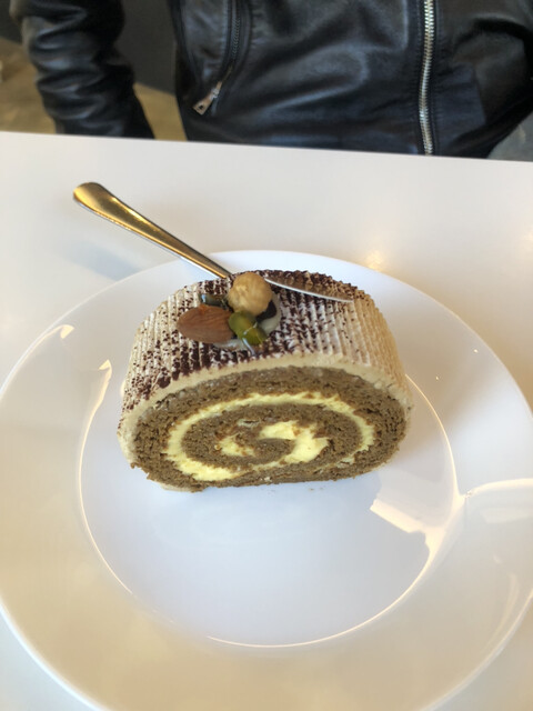 店舗はガラス張りで、カフェの席からはガラス越しに厨房を見ることができ、明るく開放感があり晴れた日はとても気持ち良い。本日はあいにく曇り雨。また、カフェ利用の場合には裏手の入り口から入り、ドリンクを選び、その後、店内のショーケースに並ぶケーキをピックアップします。今回は下記のケーキをオーダー