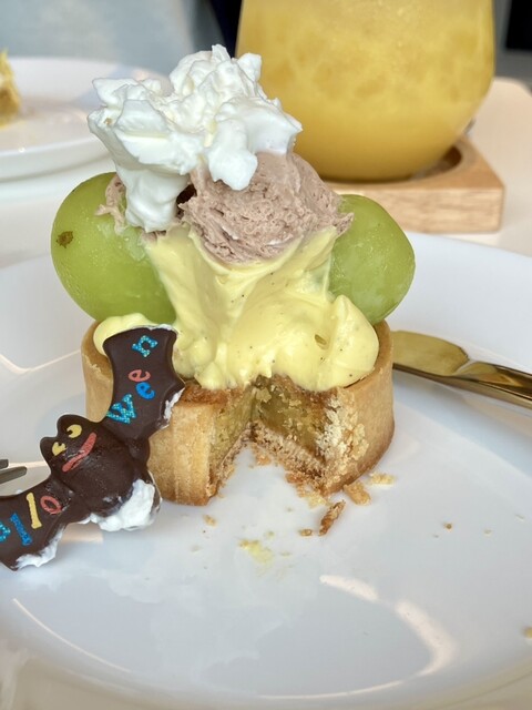 ハロウィンのチョコレート、シャインマスカット、5個、2個は1/2にカットがトッピングされ、口溶けの良い、上品な甘さな生クリーム、チョコレートクリーム、その先には、カスタードクリームがたっぷり、ベースのタルト生地はサクザㇰで美味しい。シャインマスカットのパリッとした食感、濃厚でジューシーな甘みがたまらない、大変満足させて頂きました。