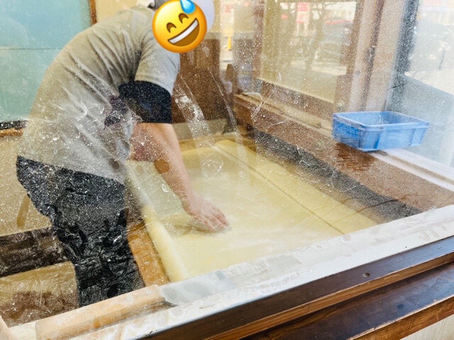 青竹を用いて手打ちされた麺は、1回に約70人前、約2時間、これを2.5回手打ちするそうです。店主は誰もやりたがらないと言っていました、16年手打ちしてるそうです。