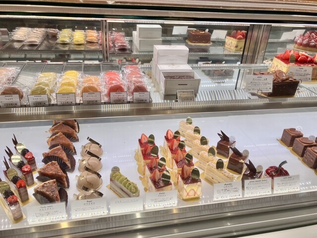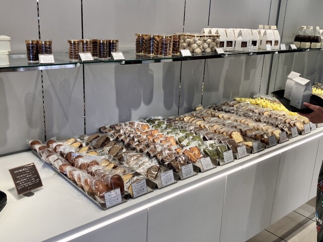 真っ白なサファードが印象的なお洒落な店舗、店内も白を基調として明るく広々としています。右側は彩り鮮やかなスイーツがショーケースに並んでいます。正面は厨房、右側は焼き菓子、右回りで店内は約20名ほどの大行列となっていました。20分程並び、こちらのスイーツを購入、入店時にはモンブランを見ることが出来ましたが、残念ながら購入することが出来なかった。