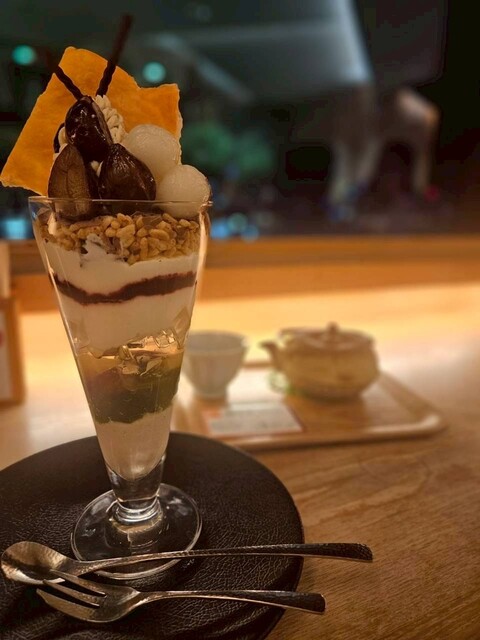 渋谷の夜景を見ながらの夜パフェと日本茶でくつろぎのひと時!