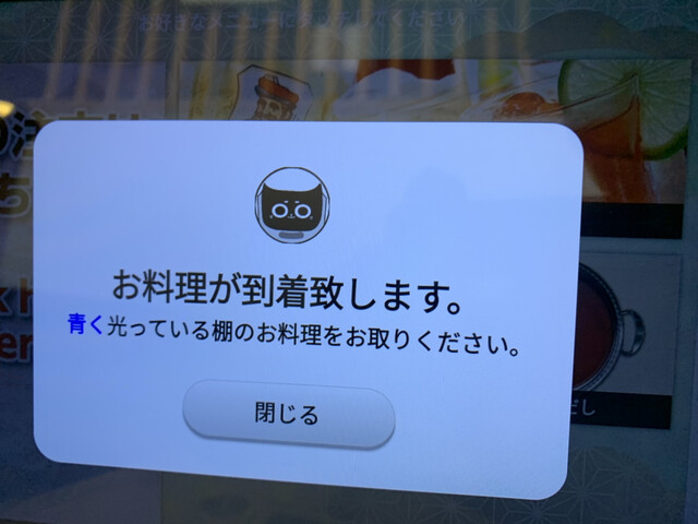 猫型配膳ロボット近付いて来たらテーブルのタブレットに告知されるのが良いですね。一人の場合、離席中に来てしまう事があるので助かります。