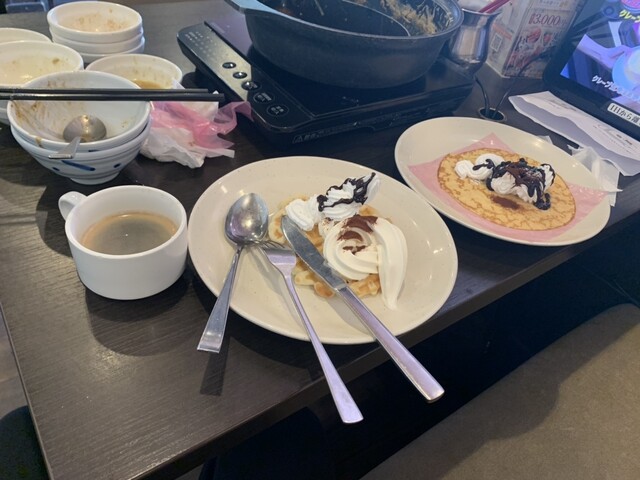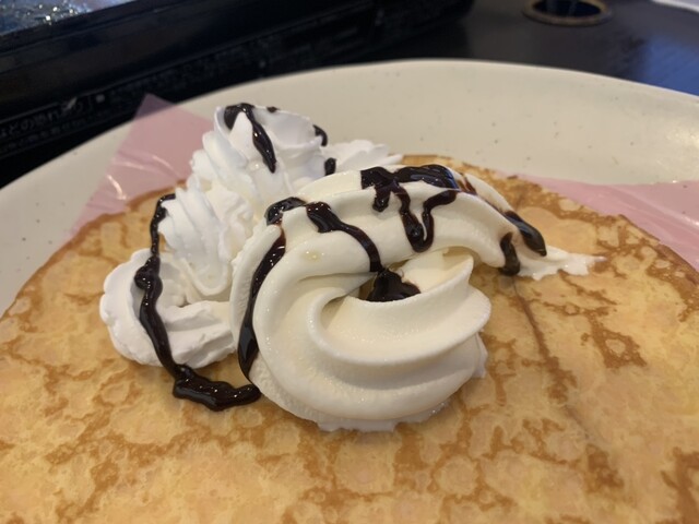 デザートでは、クレープにソフトクリームとホイップクリーム。巻いたらソフトクリームが溢れてきました。