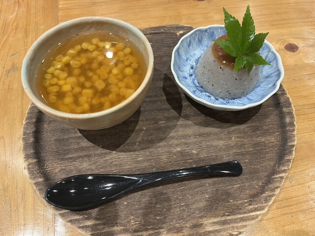 最初に写真3枚目の季節のお料理が提供されます。「蕎麦豆腐」と「とうもろこしと蕎麦の実の…」冷たい雑炊と言ったら良いのでしょうか。お名前を忘れてしまいましたが、優しい塩味ととうもろこしの甘さが相まってとても美味しかったです。