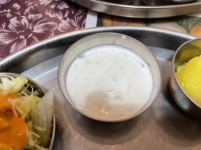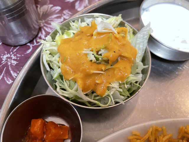 サラダ、チキンカレー、ライタ(ヨーグルトサラダ)、