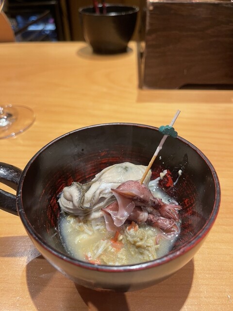 移転してからお初。シックな大人カウンターで調理風景を目の前で楽しみながらコース。