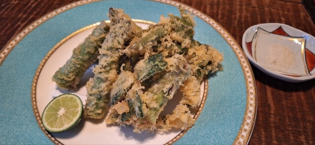 そして今回は季節限定のアスパラの天ぷらを注文しました!一皿だけ注文したのですが、十分すぎるくらいたくさん、かつ一つひとつのアスパラがとても太くて食べごたえがあったので一人ではなくシェアしていただくのがおすすめです。ジューシーなアスパラと薄い衣がよくあっていて美味しかったです。