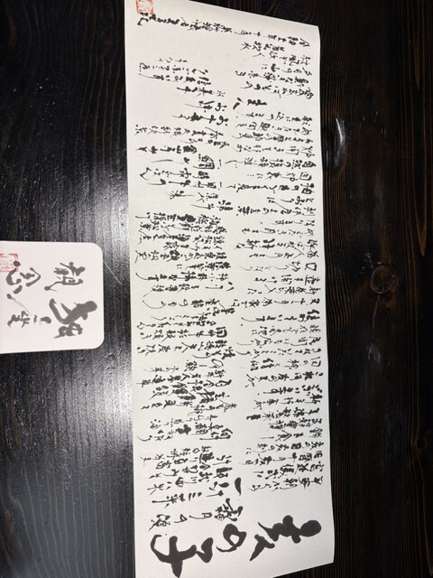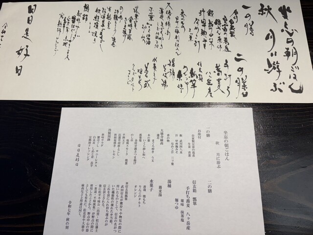夕食は、茶懐石として地元食材中心に創意工夫された料理を頂ける。最初に料理長が出て来て茶懐石の考え方と料理について説明して頂いた。メニューはとても達筆な手書きで、読み解くのに大変だったが、これも趣きあり良かった。