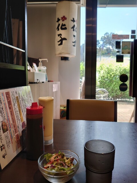 ランチで国泰寺焼1050円。胡麻ドレッシングがかかったサラダが付きます。