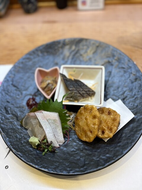 料理はホタルイカ酢味噌とお造り盛り合わせ三種、
