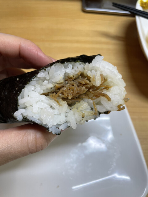 おにぎり自体はふわっと握られてて、大きめの三角の海苔でクルッと巻かれた海苔がいい塩梅で味を絞めて来ますm(_ _)m