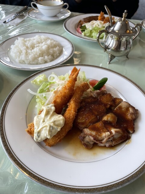 ランチメニューからエビフライと鶏のソテーのセットをセレクト。