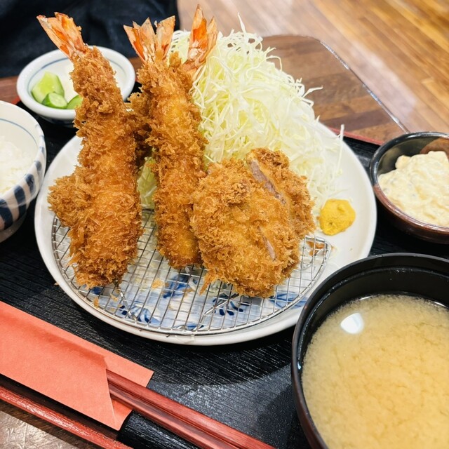 ロースカツももちろんおいしいですが、私はよくミックスフライ定食を注文します。フライはサクサクです。ヒレカツ、イカフライ、エビフライのステキなセットです。