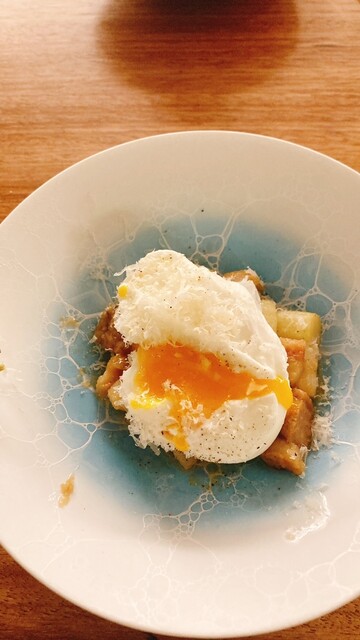 ◎ホワイトアスパラガスのニョッキ、佐助豚のラグーソース、ポーチドエッグ