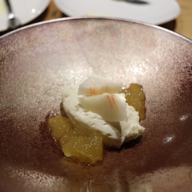 鯵の生臭さは全くなく、ナスと甘めにマリネされた裏にワインが香るグラニテでさっぱりとします。