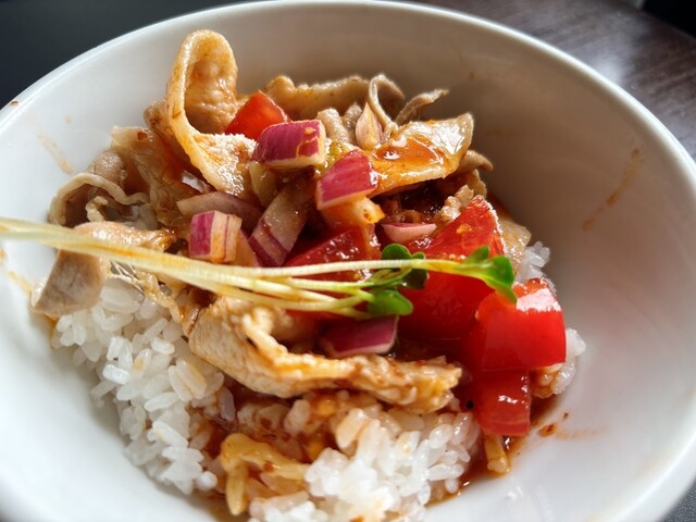 ライスに刻み玉ねぎ、トマト、豚バラ肉を乗せてスープをかければ言うことなし