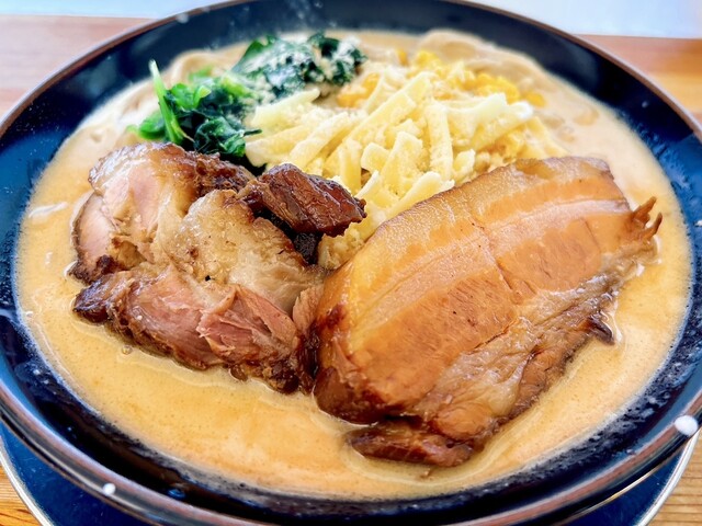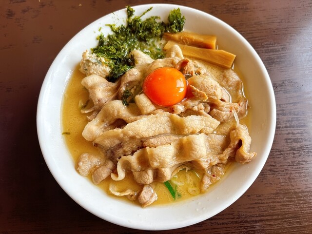 月初週限定の徳島ラーメン!毎月、楽しみにしています。今回は濃厚鶏白湯Ver、あっさりだと肉うどんに近い味わいですが、濃厚はまた違った味わいで、どちらも美味しいです。月初週のみ、麺も限定で平打ち麺があります。スープに合っていてとても美味しかったです。来月は徳島のまぜそばを食べる予定です。