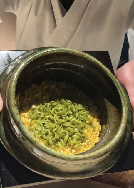 〆はとうもろこしの土鍋ごはん、鶏ラーメン