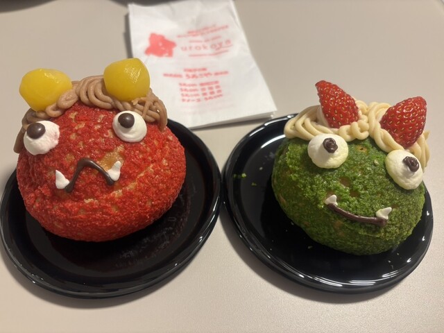 赤鬼シュークリーム、青鬼シュークリーム。いただいたので、値段は分かりません。鬼を食べて鬼退治ということのようですが、最初のスプーンを入れるのはとてもかわいそうでした。