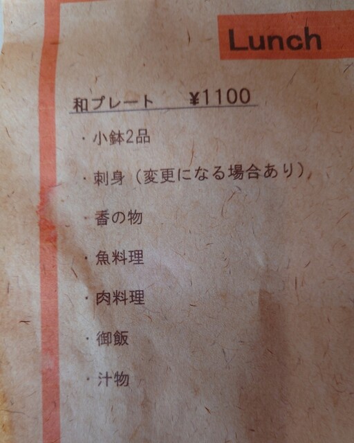ーーーーーーーーーーーーーーーーーーー12:40に予約の電話した時も、満席と言われましたが、待つのを覚悟で「洋プレート1100円」「和プレート1100円」を一つずつ、お願いしました。駐車場は、満車でしたので、他の車の前に停めるように、指示ありました。13:00ちょうど位に、店内に入ると、テーブルが2つ、カウンター席が4つ、空いていました。3人掛けのテーブル席に座りました。こちらは、お料理の提供まで、時間がかかるので、有名なお店です。予約していても、お料理の提供まで、15分かかりました。それでも、予約しない時に比べると、早いです。今まで、予約なしに来た時、夜に1時間位、待たされたことありました。ただ、待たされると、知っていたので、その時は、レターセットを持参し、3通、手紙が書けました(笑)