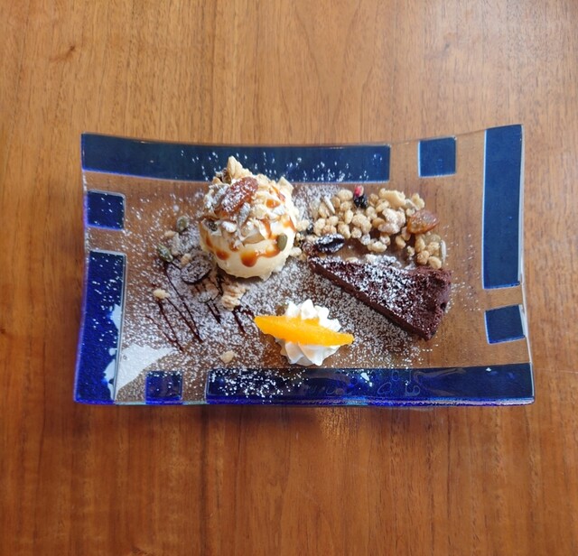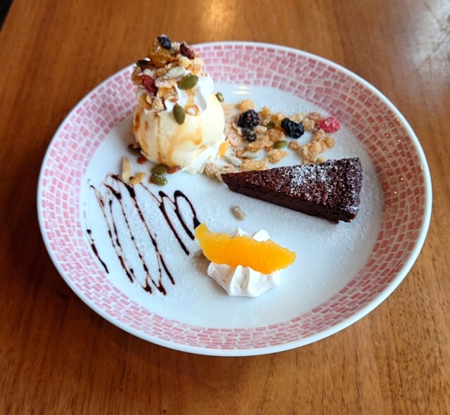 14時45分くらいに、お願いして、15時くらいに、運ばれてきました。カフェラテは、ラテアートなしですが、ミルクの風味豊かな味わいが、かんじられます。デザートは、バニラアイスと、ガトーショコラと、フレッシュオレンジに、ドライフルーツとナッツの入ったシリアルが、アーティスティックに、ちりばめられて、粉砂糖とチョコレートも、かけられていて、ヴィジュアル的にも、大変、美しいです。お味も、おいしかったです。デザートの内容は、その時々で変わるようですが、以前、夜にいただいた時も、おいしかったです。もっと、ゆっくりしたかったのですが、日が暮れる前にする用事があり、お店をあとにしました。