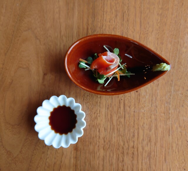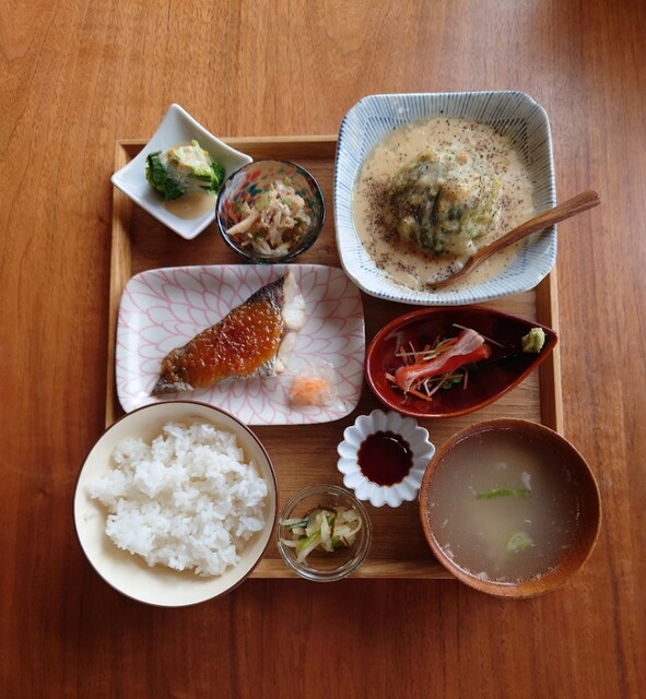 お席は、4人がけテーブルが1つ、3人がけテーブルが1つ、2人がけテーブル2つ、カウンター6席です。私は、2人がけに、座りました。こちらのお店は、注文してから、お食事が、来るまでに、時間がかかるので、有名なのですが、私以外に、お客様がいらっしゃらなくても、25分かかり、14時25分くらいに運ばれてきました。シェフの繊細な盛り付けと、こだわりのために、覚悟してますので、気になりません。主菜の「ロール白菜とうもろこし豆乳クリーム」は、味付けは、まろやかで、挽肉もおいしいのですが、白菜はロールになっていると、箸では、切りにくく、ナイフとフォークで切っていただきました。豆乳クリームは、スープのようで、添えられていたスプーンで、おいしくいただきました。「たらの柚子味噌焼き」は、焼き加減も、丁度よく、おいしいです。ただ、柚子味噌の味が、私の好みより、若干、甘めでした。大根おろしではなく、なますが、添えられています。こちらの甘酢は、さほど甘くなく、大丈夫でした。丁寧なお仕事ですね。「お刺身」は、かいわれ大根の上に、サーモン二切れです。こちらも、脂がのっていて、おいしいです。「漬物」は、大根で、塩加減もほどよいです。「おひたし」は、菜の花で白いソースが、かけられていました。このソースは、うまく、表現できないのですが、酸味があり、おいしかったです。「煮物」は、細かく切った糸コンと、こちらも、細かく切った竹の子で、だし醤油で煮たかんじで、おいしかったです。「汁物」は、洋プレートにあった赤魚のあらの、あら汁で、ねぎも入っていて、いい出汁がでていて、大変おいしかったです。ーーーーーーーーーーーーーーーーー