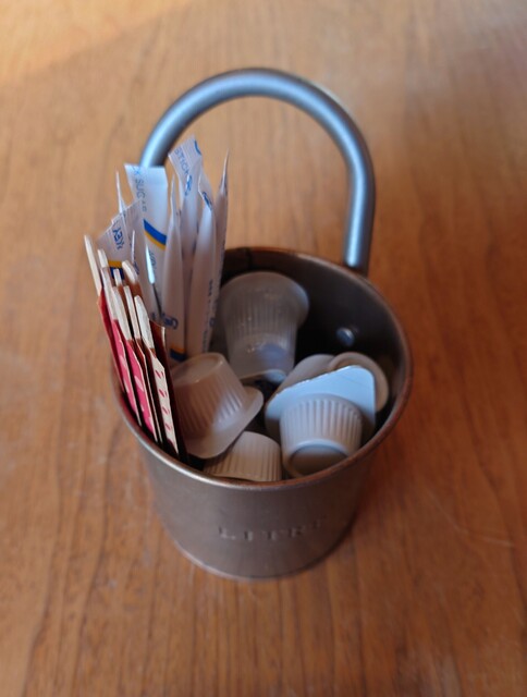 細長い小さな器には、人参・きゅうり・パプリカ・キャベツのピクルスが、入っていました。ピクルスの味は、うすい塩加減で、酢が、きいていて、おいしかったです。チキンの横に、添えられていた、サラダのような和え物は、スパゲティとキャベツが入っていて、うす味で、おいしかったです。入っている黒い食材が、何か、ちょっとわかりませんでした。